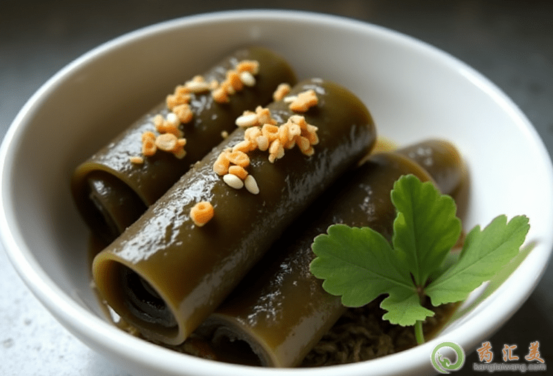 2、取鍋,加入傳統(tǒng)鹵汁,放入作法1的海帶,改轉(zhuǎn)小火鹵約5分鐘即可撈起。
