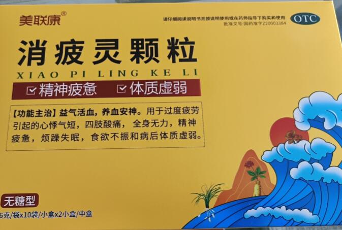 答消疲靈顆粒是正規國藥準字號中成藥,國藥準字號是:國藥準字Z20003384。消疲靈顆粒-無糖型是江西京通美聯藥業有限公司生產的6g*10袋*2小盒裝的消疲靈顆粒,消疲靈顆粒可以益氣活血,養血安…