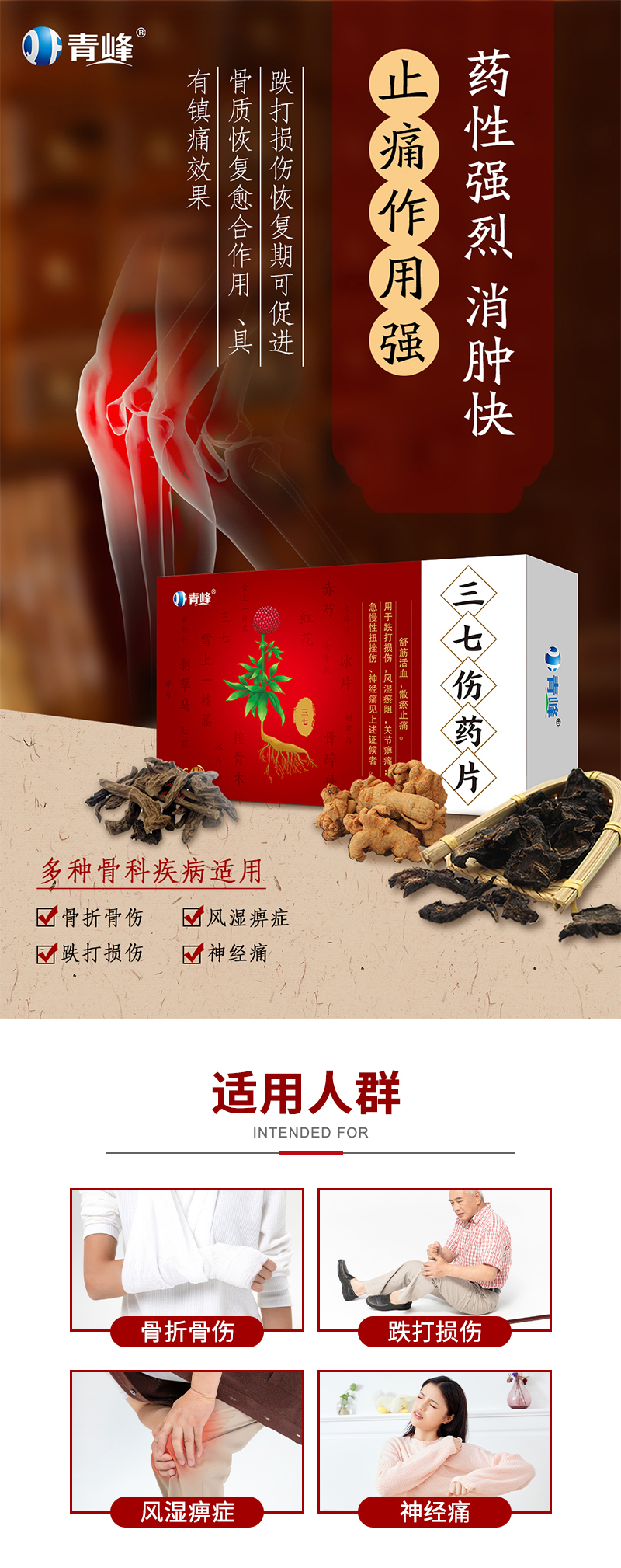 【商品成分】三七、草烏(蒸)、雪上一枝蒿、骨碎補(bǔ)、紅花、接骨木、赤芍、冰片。