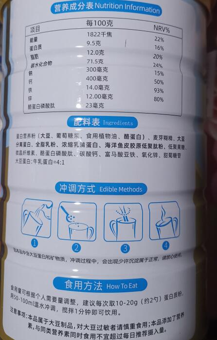 【配料表】蛋白營養粉(大豆、葡萄糖漿、食用植物油、酪蛋白)、麥芽糊精、大豆分離蛋白、全脂乳粉、濃縮乳清蛋白、低聚果糖、微晶纖維素、酪蛋白磷酸肽、胎菊糖苷、碳酸鈣、富馬酸亞鐵、氧化鋅 大豆蛋白:牛乳蛋白=4:1