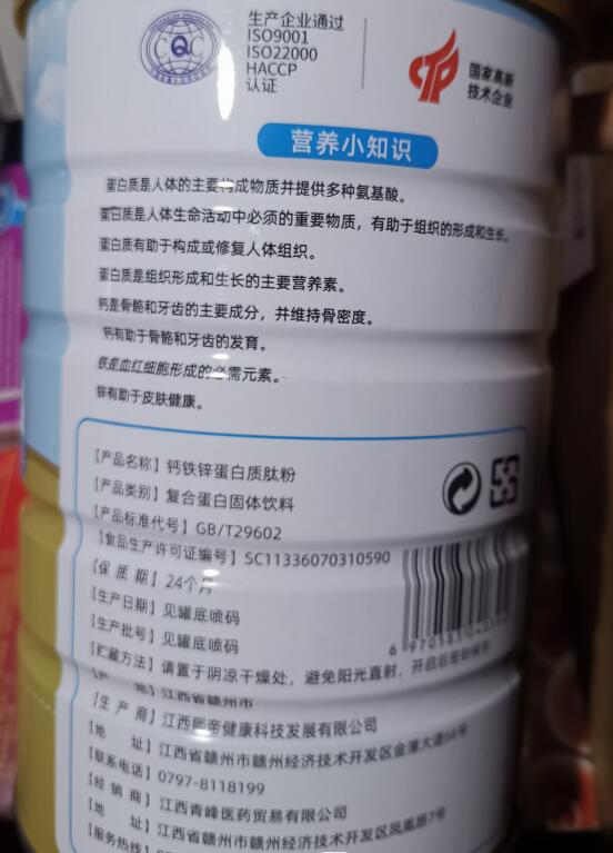 答青峰牌鈣鐵鋅蛋白質肽粉的成分是蛋白營養粉(大豆、葡萄糖漿、食用植物油、酪蛋白)、麥芽糊精、大豆分離蛋白、全脂乳粉、濃縮乳清蛋白、低聚果糖、微晶纖維素、酪蛋白磷酸肽、胎菊糖苷、…
