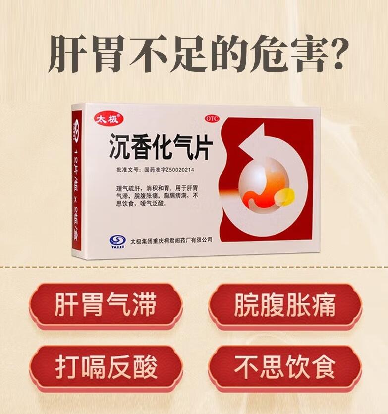 沉香化氣片主治:理氣疏肝,消積和胃。用于肝胃氣滯,脘腹脹痛,胸膈痞滿,不思飲食,噯氣泛酸